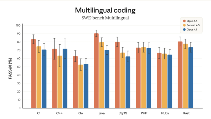 SWE-bench Multilingualでは8つのプログラミング言語のうち7つでトップの成績を記録し、視覚認識、推論、数学のスキルも前世代モデルから向上している。中程度のeffortレベルで設定した場合、Opus 4.5はSonnet 4.5の最高スコアに匹敵しながら、出力トークンを76%削減する効率性を実現した。