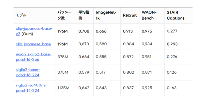 性能評価では、日本語ImageNet-1k、Recruitの評価データセット、WAON-Bench、STAIR Captionsの4つのデータセットを使用した。clip-japanese-base-v2はパラメータ数196Mと最も少ないにもかかわらず、平均性能0.708を達成し、前バージョンの0.673、waon-siglip2-base-patch16-256の0.664、Googleのsiglip2-so400m-patch14-224の0.642を上回った。