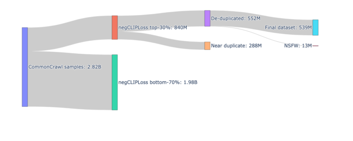 clip-japanese-base-v2は、Common Crawlの2020年から2025年までの6年分39スナップショットを対象に画像URLを抽出し、フィルタリング前の画像サンプル数を前バージョンの10億件から28億件に増加させた。最終的に5.4億件の高品質な画像・テキストペアを学習データとして使用している。