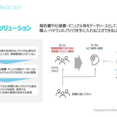 当社は、大規模言語モデル(LLM)を活用したソリューション開発とPoC(概念実証)を提供します。単なる実験や検証にとどまらず、業務課題に即したユースケース設計と開発するAIシステム像を見える化するプロトタイプ開発を通じて、導入効果を具体的に検証。不安を払拭し、実務に活かせる形で商用化へのステップを築きます。