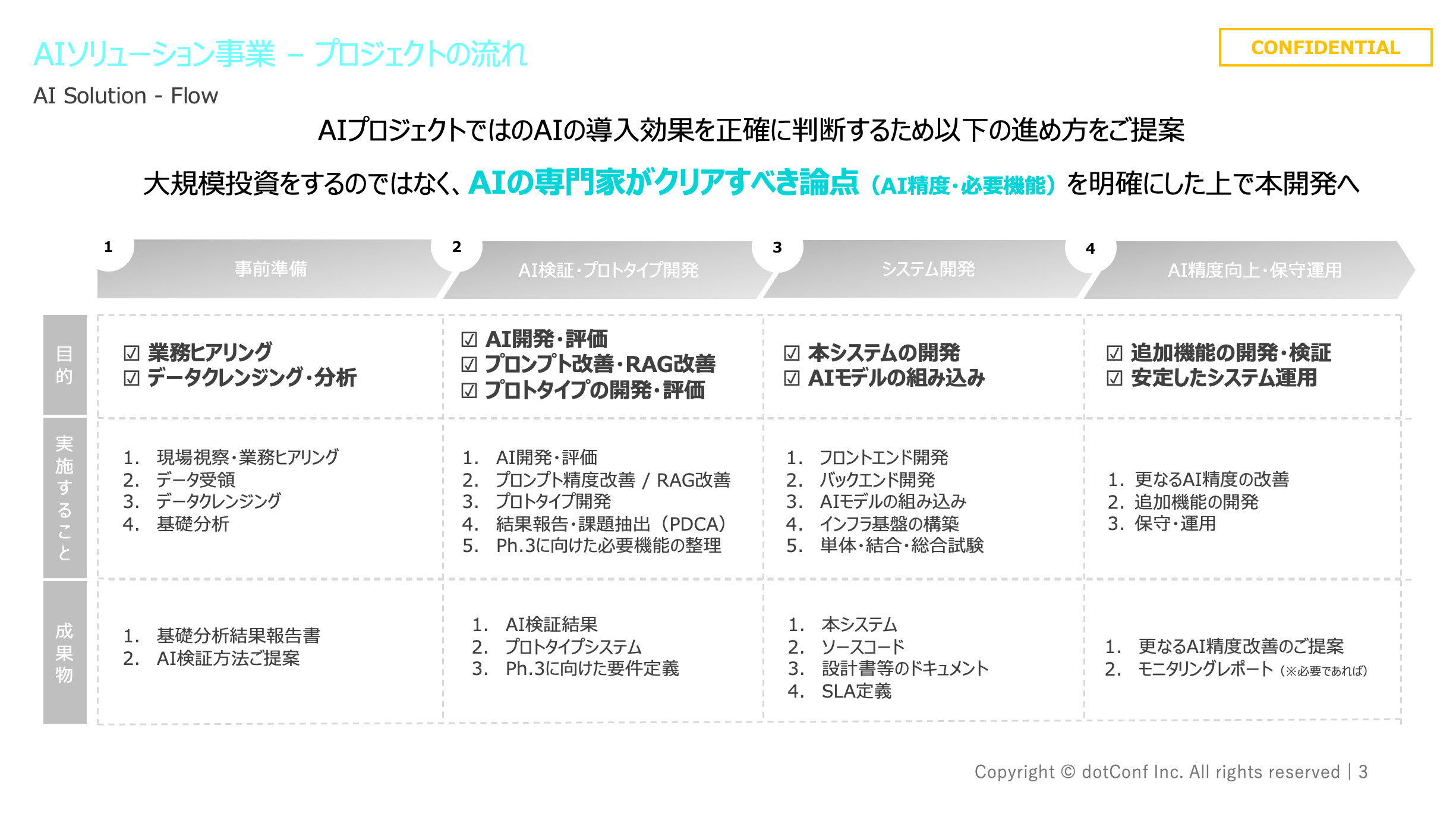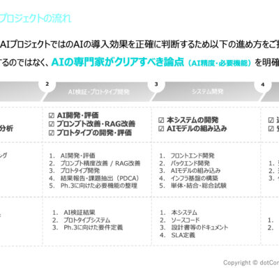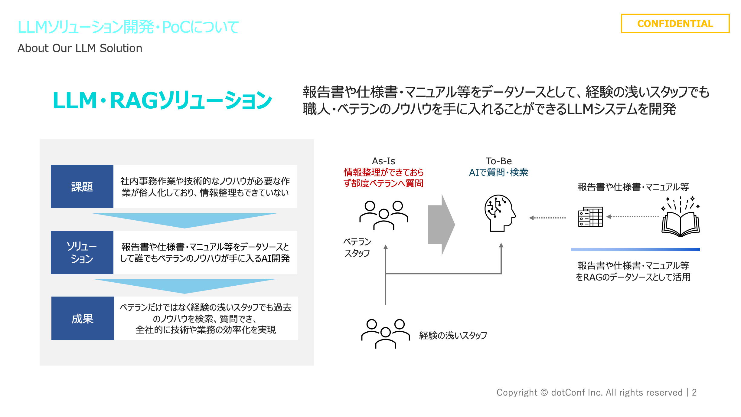 LLMを用いたドキュメント要約、FAQ対応、レポート生成、ナレッジ検索など、幅広いシーンに対応可能。短期間でPoCを実施し、導入可否の判断をスムーズに進められます。