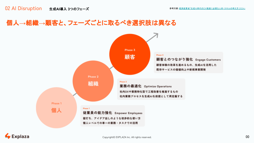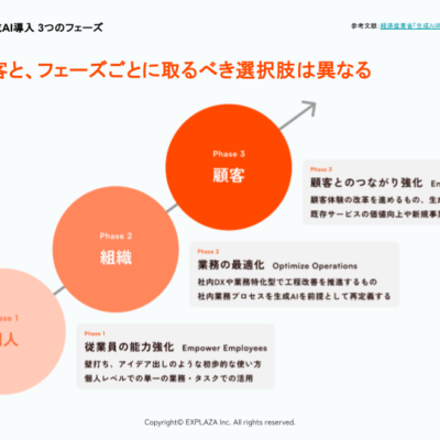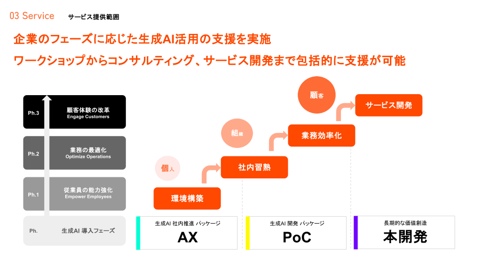 社内業務の効率化、既存サービスへの生成AI機能の組み込み、新規事業開発など、あらゆるフェーズでAI活用を支援します。