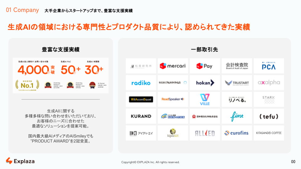 | 事業内容 | 価値ある生成AIのプロダクト開発・社会実装 生成AIの幅広い知見と実績に基づく、AIプロダクト開発とコンサルティング支援 |