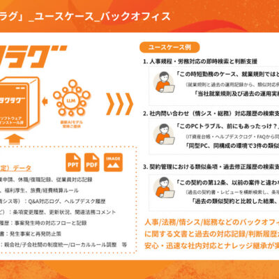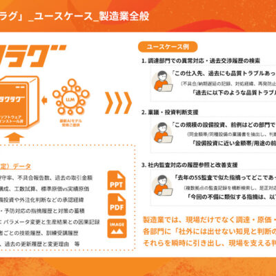 機密情報も外部に出すことなくAIに活用できるため、セキュリティ要件の厳しい企業でも安心して導入できます。PDFやOffice文書、画像データなど多様な社内資料をAIが読み取り、自然文の質問に対して実務で使える高精度な回答を返します。属人化したナレッジの共有や情報検索の効率化を支援し、現場で“本当に使える生成AI”として業務改善に貢献します。