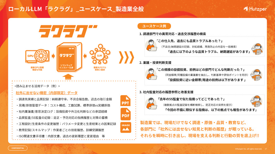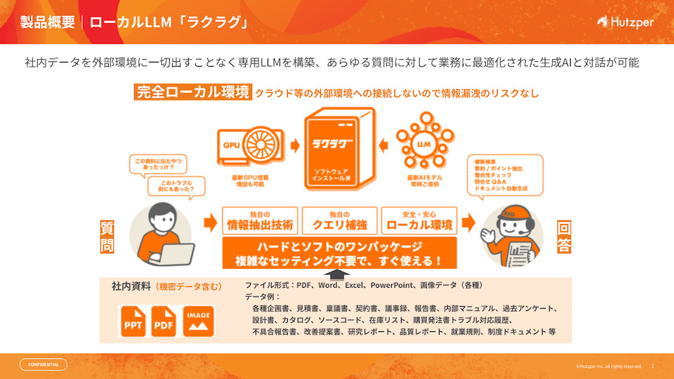 機密情報も外部に出すことなくAIに活用できるため、セキュリティ要件の厳しい企業でも安心して導入できます。PDFやOffice文書、画像データなど多様な社内資料をAIが読み取り、自然文の質問に対して実務で使える高精度な回答を返します。属人化したナレッジの共有や情報検索の効率化を支援し、現場で“本当に使える生成AI”として業務改善に貢献します。