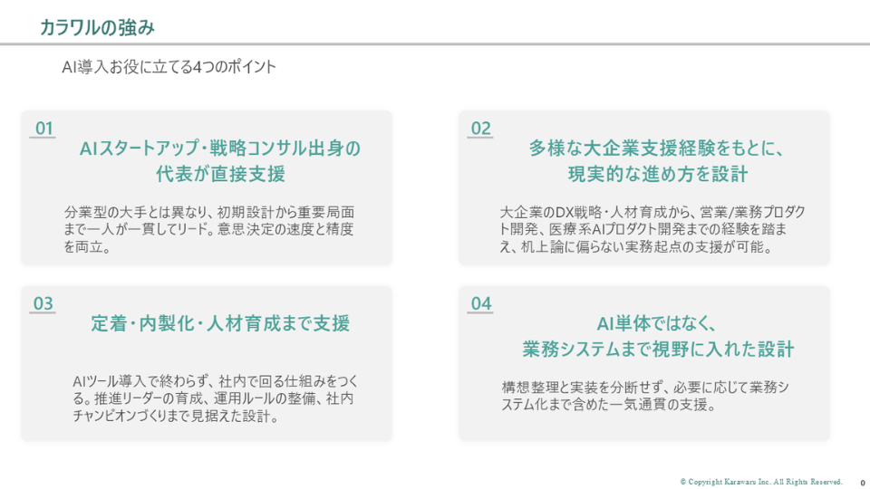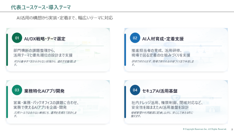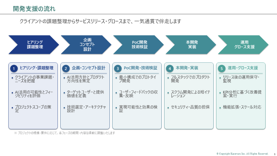 株式会社カラワルの「PoC止まりにしないAIエージェント開発」は、AI導入の企画・要件整理からPoC、本番開発、運用定着までを一気通貫で支援する受託開発サービスです。