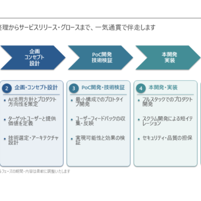 経営視点と技術力を融合し、企画・要件定義からPoC、本番開発、運用定着までを一気通貫で支援。「戦略だけで終わらない、開発だけで迷走しない」AIパートナー