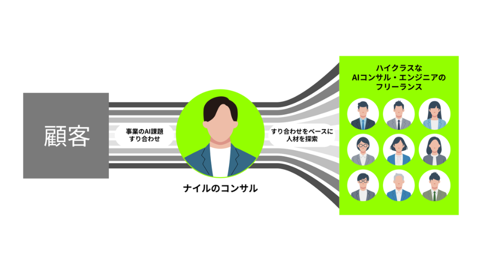 単なるスキルマッチングではなく、ナイルのコンサルタントが事業課題を整理し、「何を作るべきか」「どこにAIを使うべきか」から設計します。