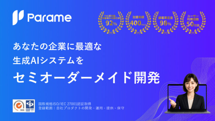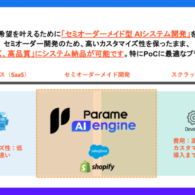 顧客専用のAIシステムを、早く・安く・高品質に提供するために、AIの共通開発基盤『Parame AI engine』を独自開発。共通開発基盤による『セミオーダーメイド開発』により、お客様の多様な希望を実現いたします。