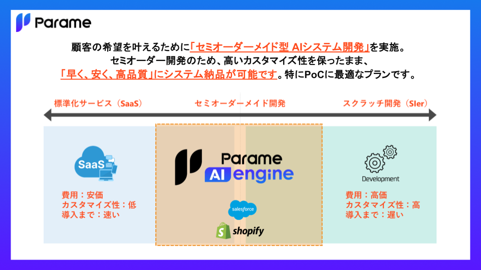 顧客専用のAIシステムを、早く・安く・高品質に提供するために、AIの共通開発基盤『Parame AI engine』を独自開発。共通開発基盤による『セミオーダーメイド開発』により、お客様の多様な希望を実現いたします。