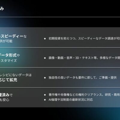 「高品質×権利クリア×商用利用OK」なデータを提供し、データセントリックなAI開発を強力にご支援いたします。