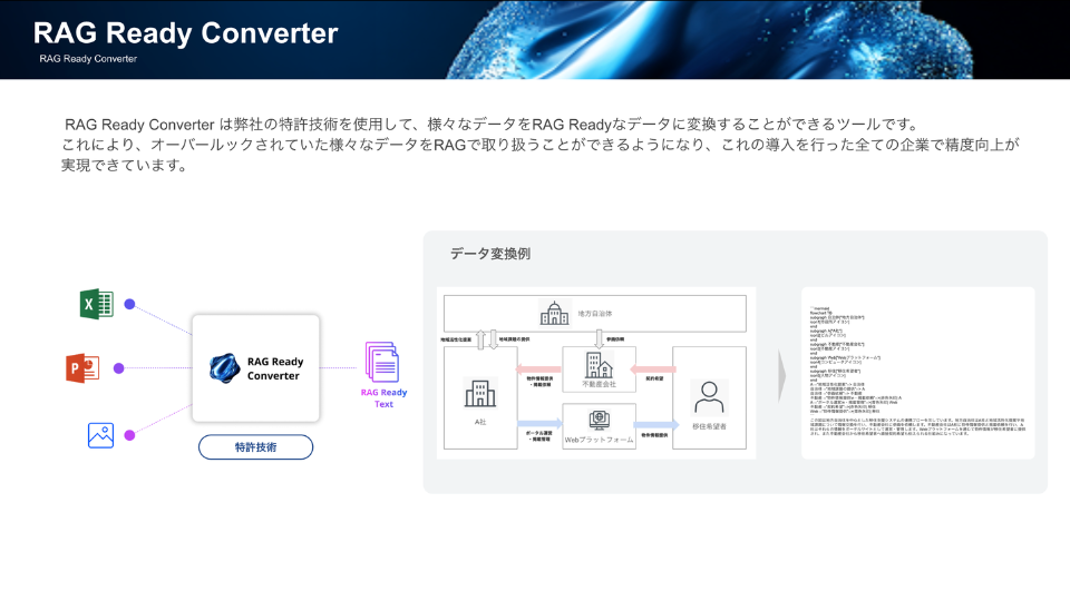 RAG Ready Converter は独自の特許技術により、単に文字起こしをするOCRとは違い、画像などで説明されている情報についても、同様の情報が伝わるようなRAG Readyなプレーンテキストに変換する解釈まで対応しているデータコンバーターです。