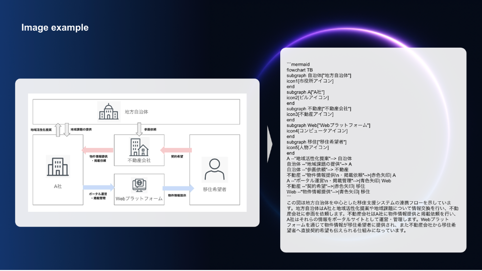 ・画像内の構成図やフローチャート → Mermaid記法等で論理構造を崩さずテキストに変換3APIとGUI両対応で御社の環境にすぐ導入可能