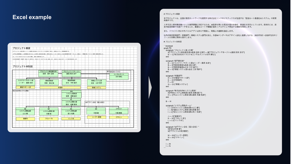 ・Excelの結合セルや図形が混在する資料 → 縦横の関係がずれていないマークダウン形式の表