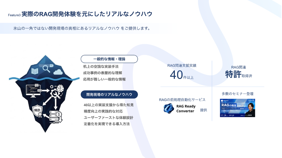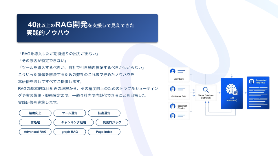 一般的な研修にありがちな理論の紹介ではなく、40社以上のRAG開発支援を通じて実際に直面した課題と、その解決策をベースにした内容です。
