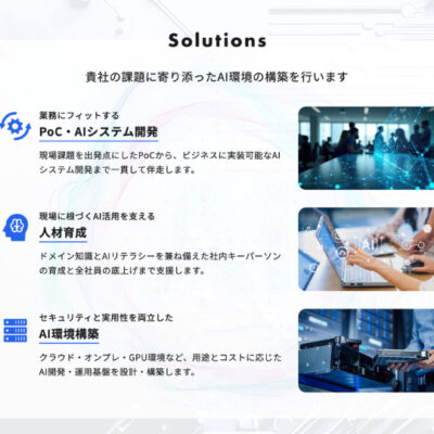 「PoCで終わらないAI実装」をテーマに、業務課題の整理からAIシステム開発、GPU環境構築、社内人材育成まで、現場で運用され続けるAIの仕組みづくりを伴走型でサポートします。