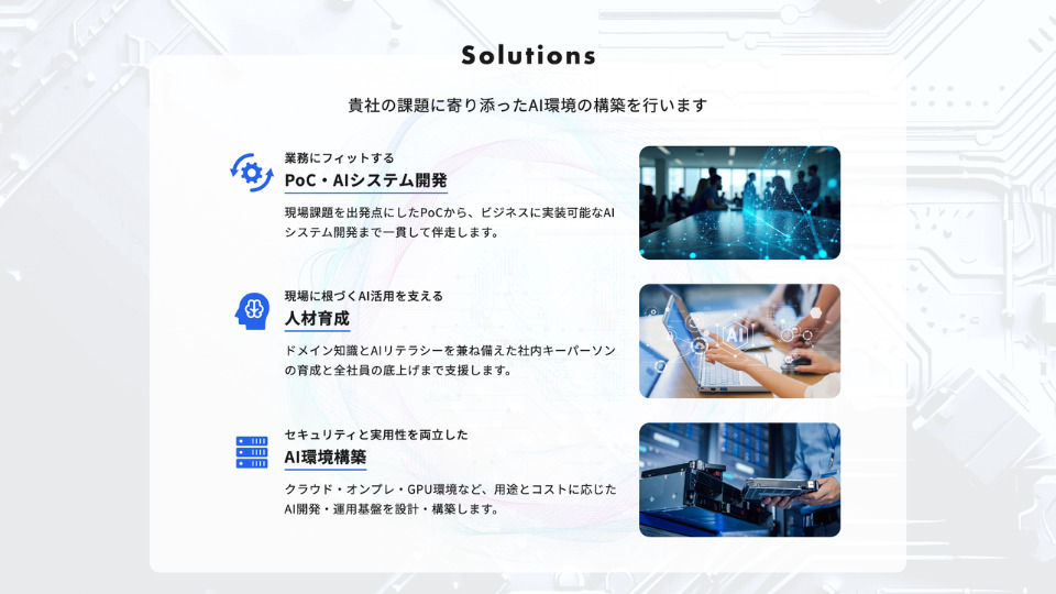「PoCで終わらないAI実装」をテーマに、業務課題の整理からAIシステム開発、GPU環境構築、社内人材育成まで、現場で運用され続けるAIの仕組みづくりを伴走型でサポートします。