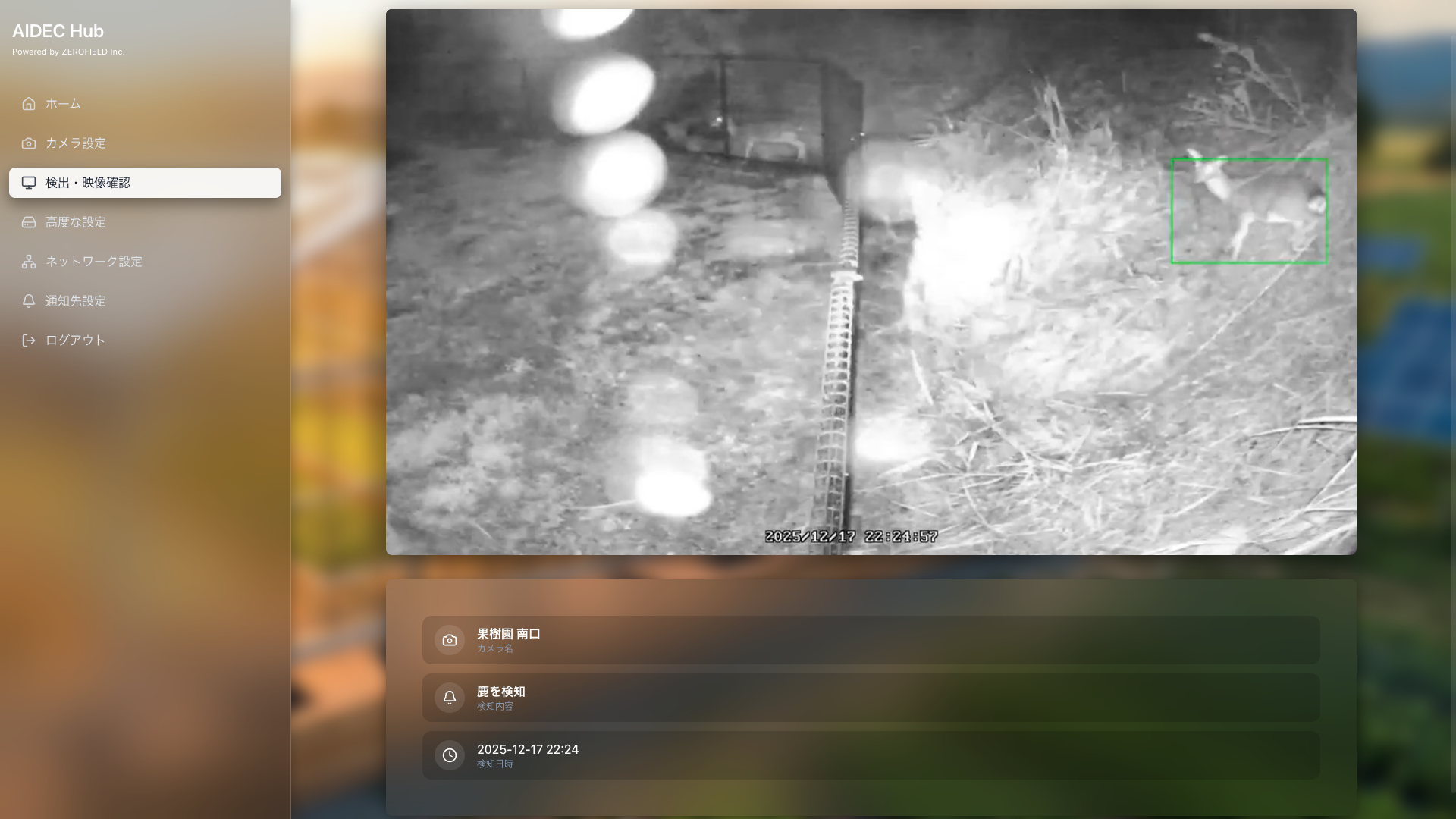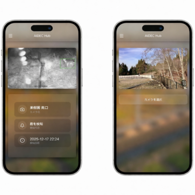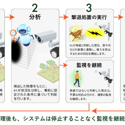 AIDECとは、AIを活用して野生動物の侵入をリアルタイムに検知・通知・撃退するシステムです。