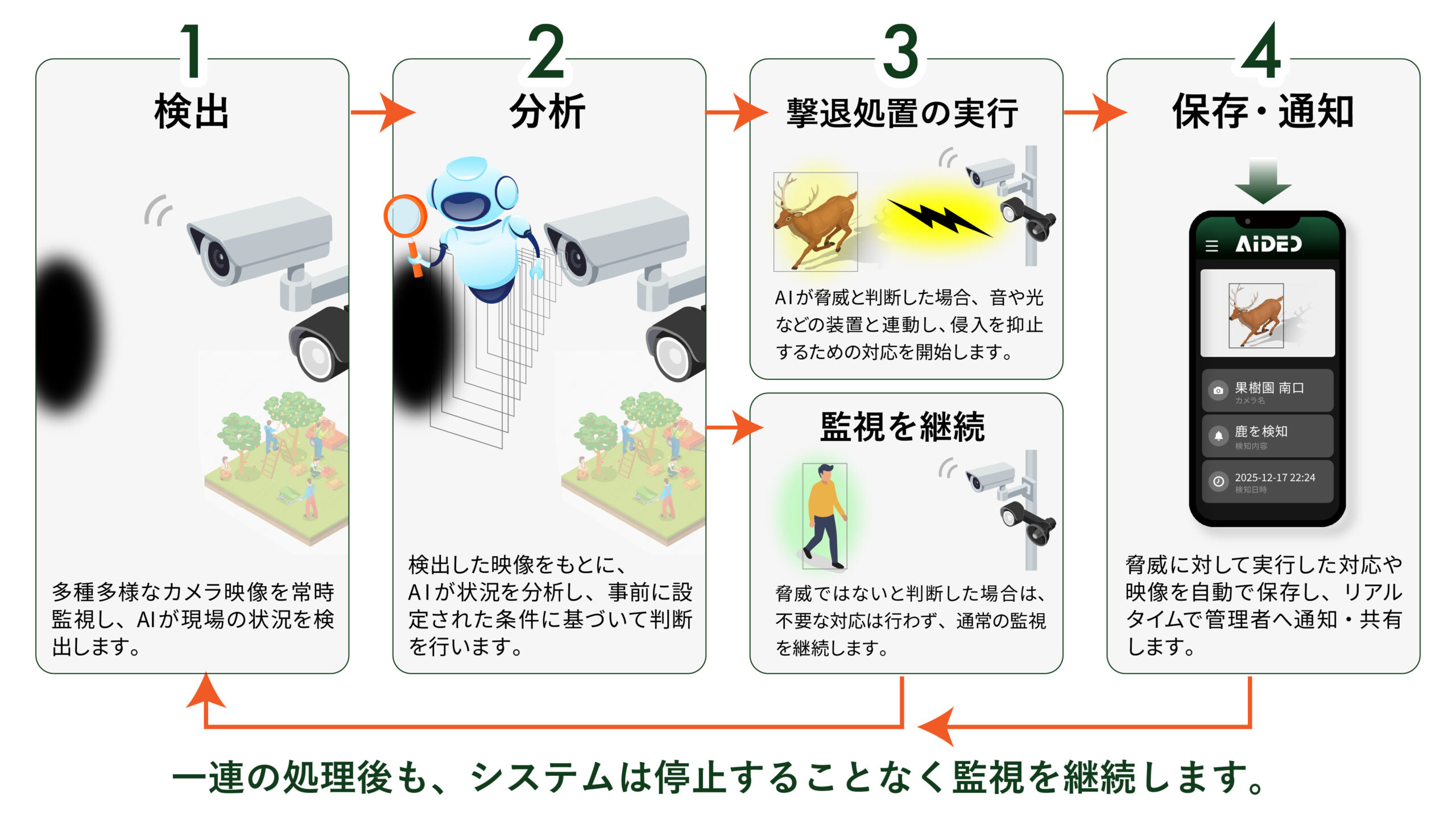 熊・イノシシ・鹿などの脅威のみを検知対象とし、人や犬猫などの無害な存在は識別してスルーします。2検知・通知・撃退をリアルタイムに実行