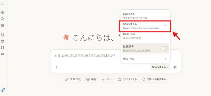 まず、Claudeにログインしたら、テキストボックス右下のモデル選択からClaude Sonnet 4.6を選択します。あとはそのまま質問するだけで利用可能です。