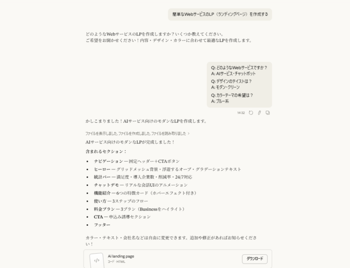 Claude Sonnet 4.6を用いて「AIサービスのランディングページ作成」を実施したところ、簡単な質問に答えるだけで短時間かつ初回出力から高品質なデザインと構成を生成できました。