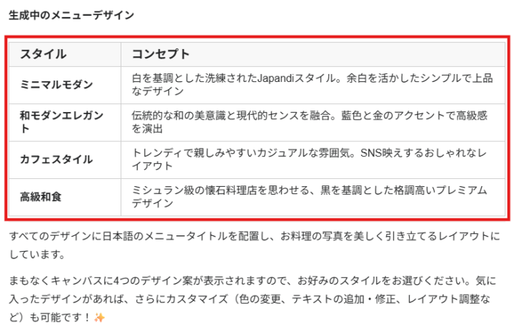 生成が開始されると、スタイルごとのコンセプトが表形式で表示され、ミニマルモダンや和モダン、高級和食など複数のデザインが用意されていました。配色やレイアウトの特徴も整理されているため、仕上がりのイメージがつかみやすく、どの方向で作るか選びやすい点が使いやすいと感じました。