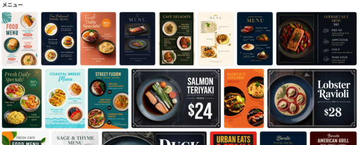 また、すべてのデザインにおいてメニュータイトルや料理名が配置され、料理写真が引き立つレイアウトになっている点も印象的でした。一方で、商品の細かい説明文については、一部で文字が不自然に表示されている箇所もありました。そのため、実際に運用する際には、自分でメニューに入れたい文章をプロンプトに打ち込む必要はあると感じました。