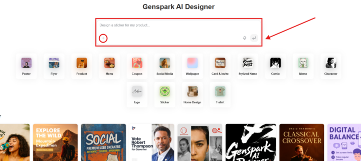 Genspark AIデザイナーには、ポスター・チラシ・商品・メニュー・クーポン・ソーシャルメディア・壁紙・カード&招待状・スタイリッシュ・コミック・ミーム・キャラクター・ロゴ・ステッカー・ホームデザイン・Tシャツなど、幅広いカテゴリのテンプレートが用意されています。