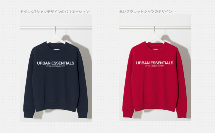 実際にTシャツテンプレートを選択し、用意されているデザインをベースに自分好みにカスタマイズしてみました。上記の画像のようにテンプレートにはTシャツだけでなく、スウェットやパーカー、タンクトップなどさまざまな種類のアイテムが用意されており、画像のように多くのデザインから選択できます。