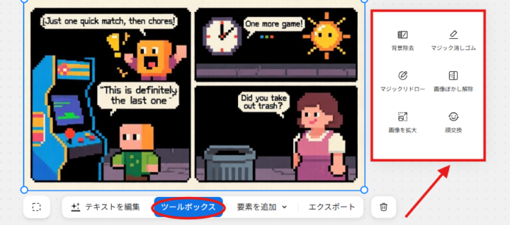 「ツールボックス」を使うと、背景除去・マジック消しゴム・マジックリドロー・画像のぼかし解除・拡大・顔交換など、幅広い編集機能を利用できます。