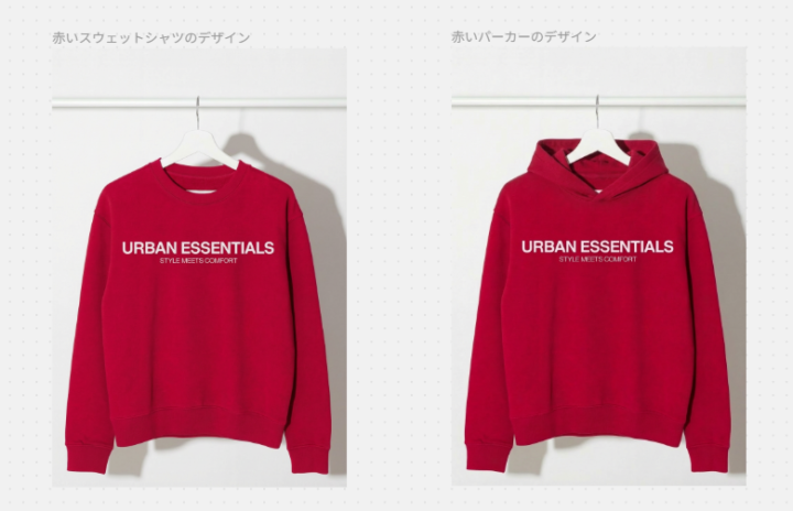 さらに、赤色のスウェットをもとに、デザインはそのままで形だけを変更する編集も試しました。左側のスウェット画像を選択し、編集内容として「パーカーにしてほしい」と指示したところ、一番初めに選択したデザインを保ちながらパーカー風の形状へ変更できました。