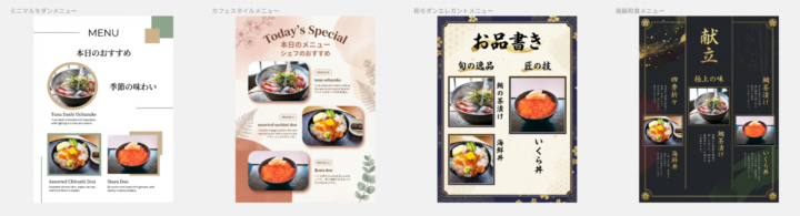 例えば、ミニマルモダンでは余白を活かしたシンプルで洗練された構成になっており、カフェスタイルでは柔らかい色味と装飾で親しみやすい雰囲気に仕上がっています。一方で、高級和食スタイルでは黒や金を基調としたデザインとなっていて、店舗のブランドイメージに応じて使い分けができると感じました。
