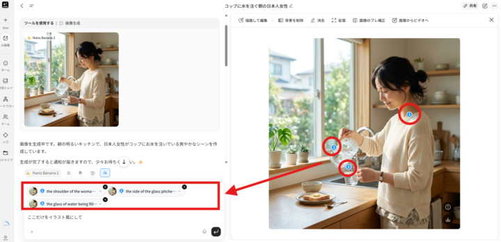 上記で生成した画像の編集したい箇所を選択し、テキストで「ここだけをイラスト風にして」と指示します。