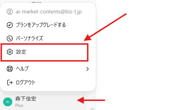 まず、ChatGPTの画面左下にある自分の名前またはアカウント部分をクリックします。すると上記の画像のようにメニューが開くので、その中の「設定」を選択します。