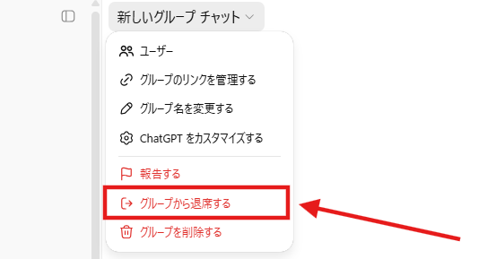 上記の画像のように、グループチャットでは画面右上のメニューから各種管理操作を行うことができます。