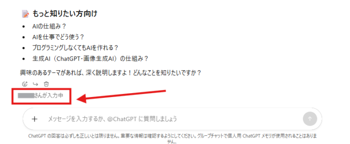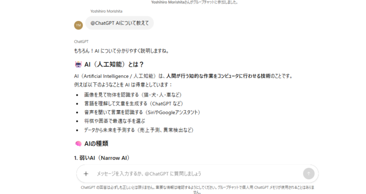 上の画像は、実際に ChatGPTグループチャットを利用しているときの画面です。複数の参加者が同じチャット内で発言し、それに対してChatGPTがリアルタイムで回答している様子がわかります。